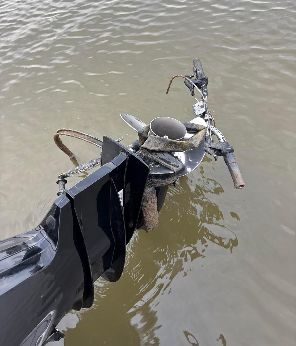 Of all the different things that could potentially mess up an outboard (rocks, stumps, rope, etc) I’ve got to say that a bike was not on my list. 😳
