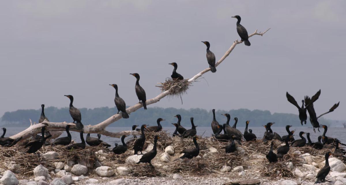 > Each year, from Apr to Oct, DEC and U.S. Fish and Wildlife personnel scare off cormorants with pyrotechnics and boats.