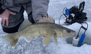 > Darren “I saw a mark on the ‘Scope and thought it looked big. Casted at 60’ away and twitched twice. Felt the tick so set the hook. No fight, just dead weight. Brought it in to realize 2 walleye had been hooked. One was a 23.5” and the other a 25.25”. If I didn’t have my kids and dad with me I doubt anyone would believe it.”