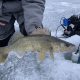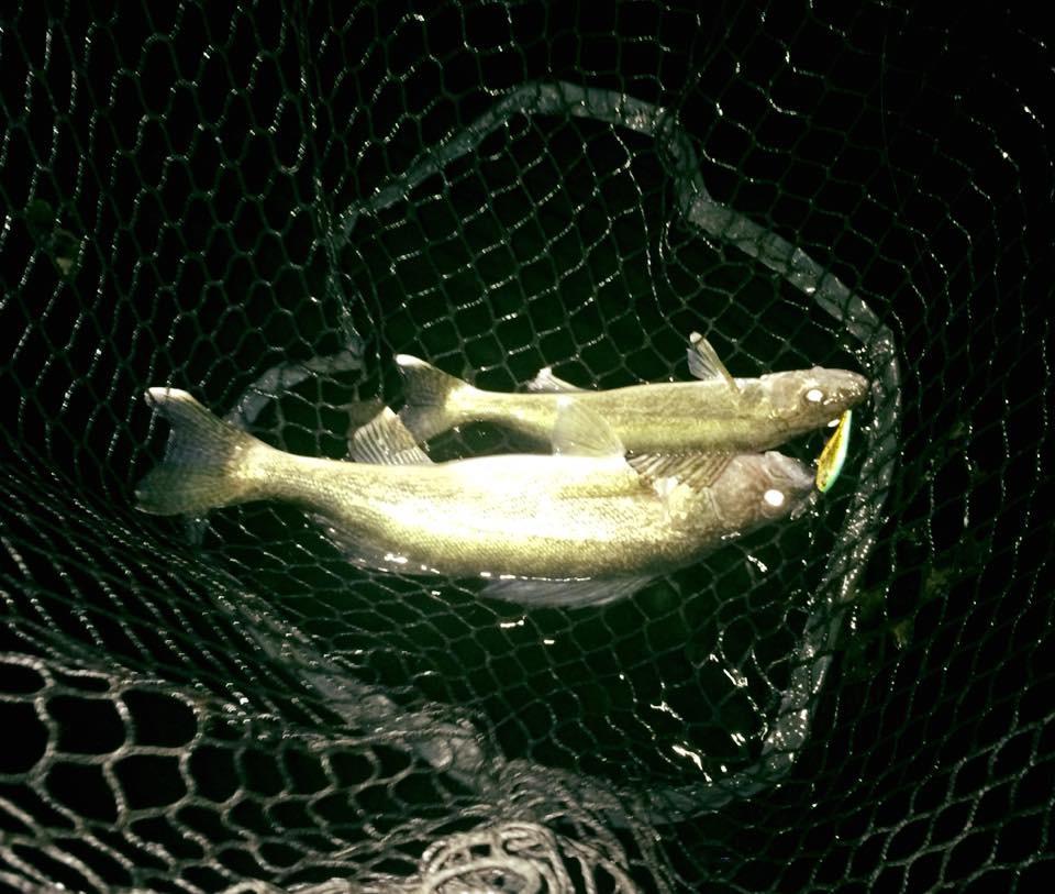 > “My dad and I were pulling #7 Berkley Flicker Shads on shallow sand flats under an October full moon in Ottertail County [MN]. Knew we had a nice walleye hooked up but didn’t realize it was two gravel lizards until after we netted them and the bigger one rolled over. Pretty cool and the only 2-for-1 I’ve had since.”