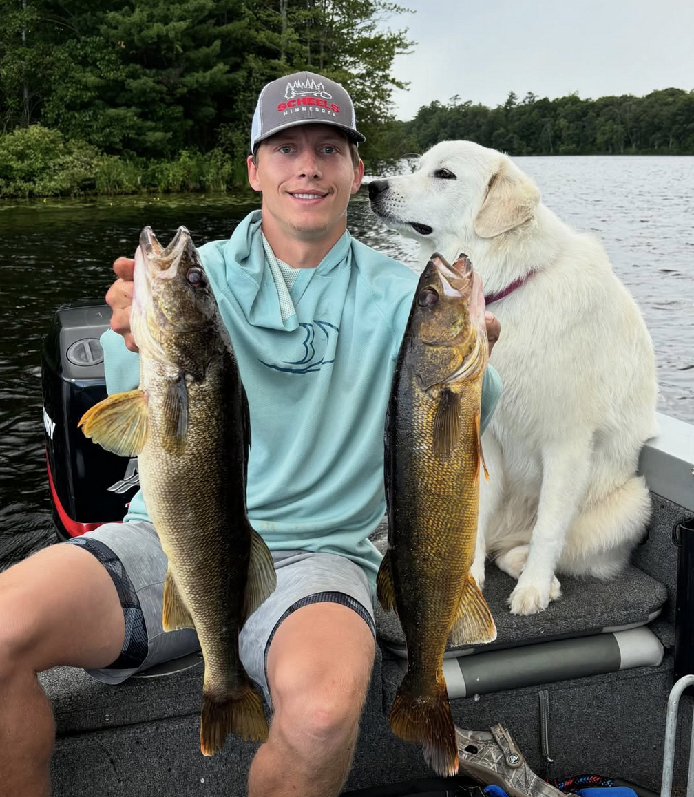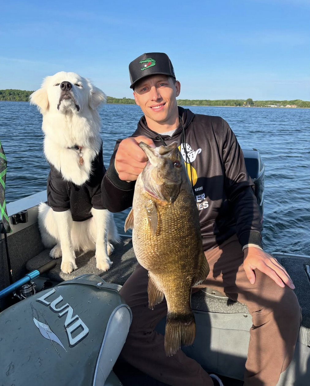 Absolutely love this shot from Easton Brodzinski on IG. Working the weedlines for mid-summer wallies with his best fishin' buddy, Luna, backing him up lol.