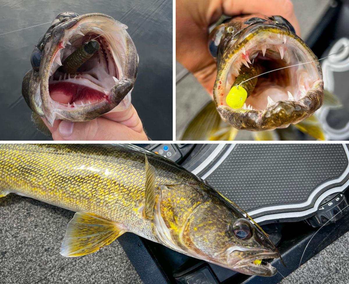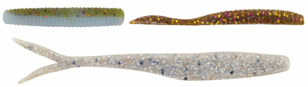 My “bonus” catches while bassin’ have been on Ned rigs with MaxScent Lil Generals (left) and then numerous times while dropshotting a MaxScent Flat Worm (right)..but they also have a more walleye-esque profile called the Flatnose Minnow (bottom) that I feel stupid for not snap-jigging in the weeds or dancing on a dropshot yet: