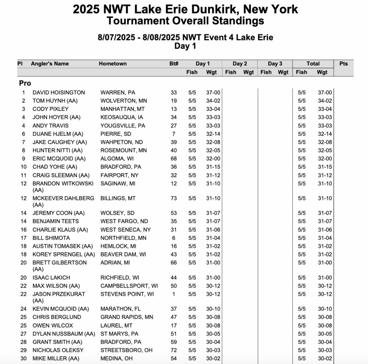 There were 30 pros that brought 30+ lbs (5 fish) to the scale on day 1 of the Lake Erie NWT out of Dunkirk, NY. And this is a no-cull tourney. Believe they’re allowed to put up to 8 total fish in the box before they have to call it quits, and weigh their heaviest 5 out of that batch.
