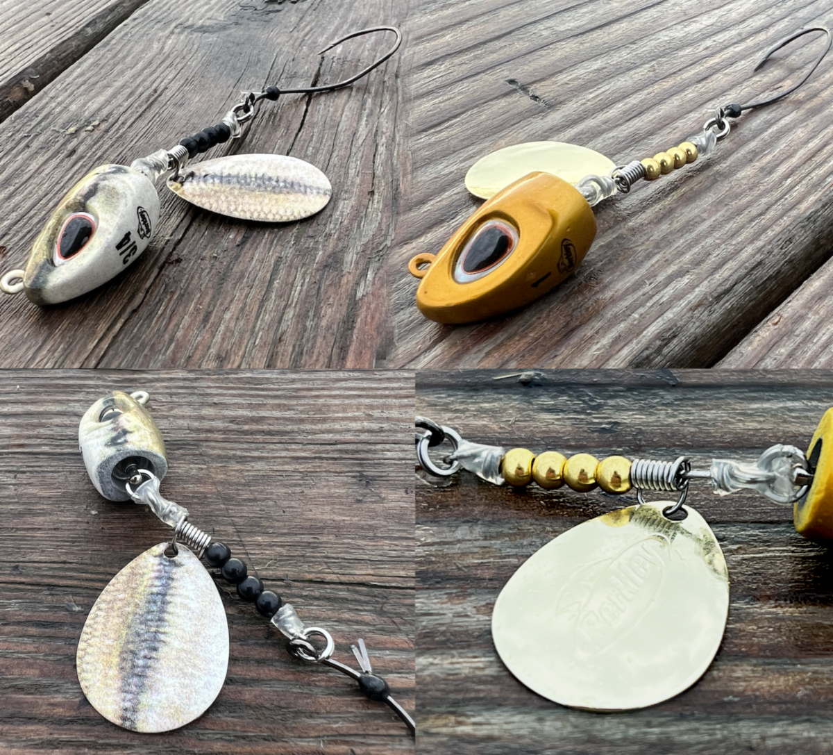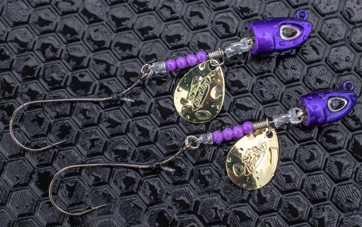 > “4 beads to the back – optimized spacing so the blade's location vibrates right into the worm. Too far back, the blade is out of control – too close, not enough wiggle. Our clevis is quick-change – you can swap blades. Walleye guys love custom colors, so we suited that. Our Berkley blades are custom: no stock sizes – we have special cupping and paint jobs...front and back for each color."