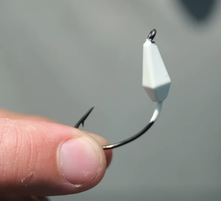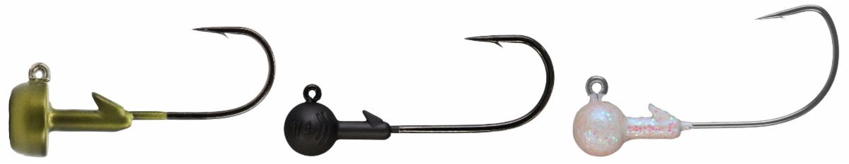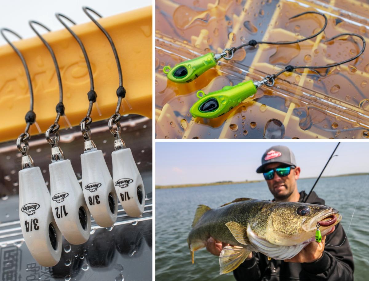 It’s made of 95% pure tungsten and has flat, faceted sides so it shows up better on live sonar. Has a wider gap for tipping with a variety of live bait options, including larger minnows: