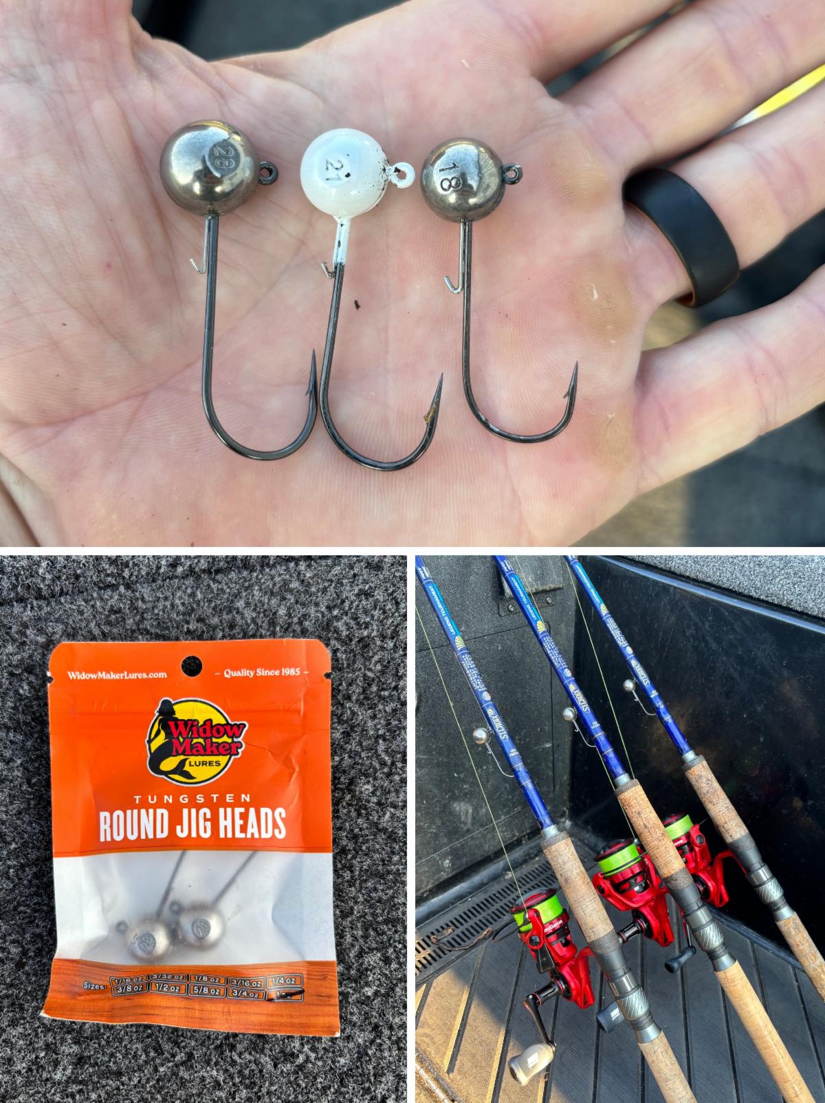 His jigs were tied to an 8-foot, 15-lb leader of Trilene 100% Fluorocarbon. His main line was 10-lb Sufix 832 in high-vis green. His line was spooled to 2000 series Lews Custom Pro spinning reels. For rods, he opted for Elite Rods Black Series. His model of choice was the 7’ 1” with medium-light power and extra-fast action.