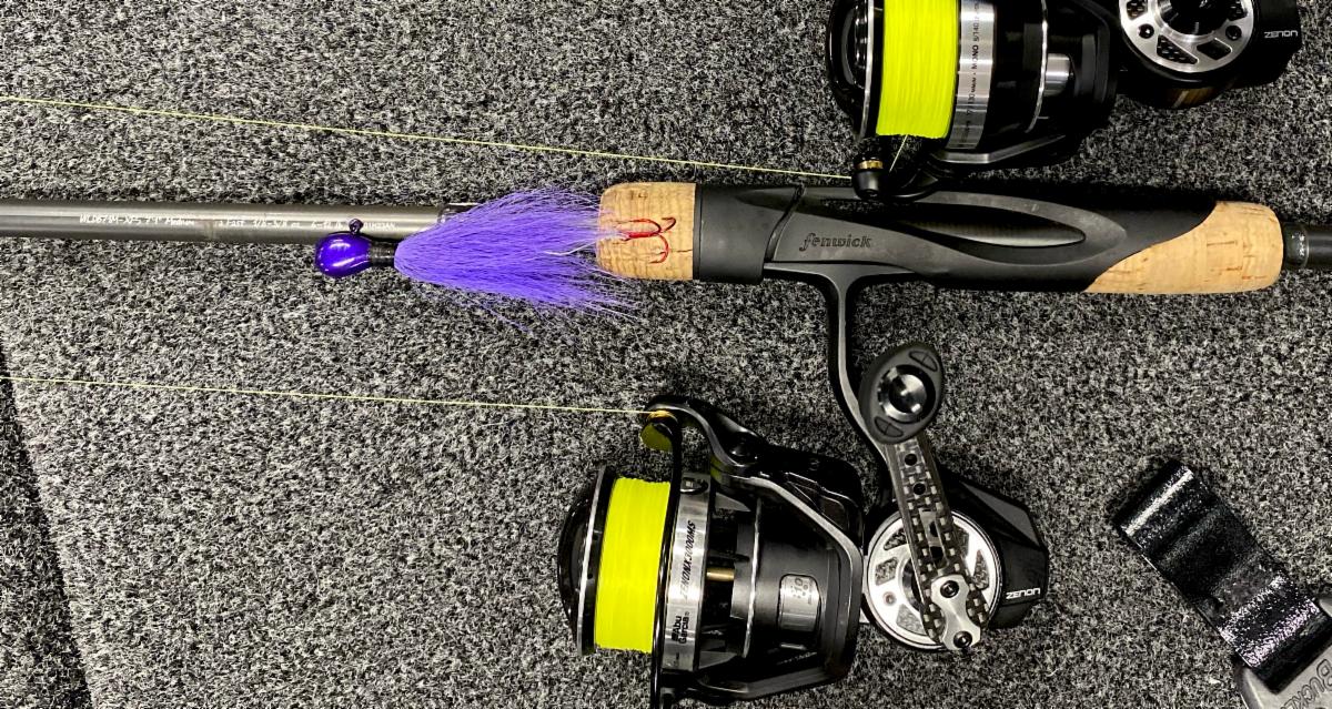 > "Fishing that on a size-30 Abu Garcia Zenon [spinning reel] and the rod that I really like with the hair jig is a 7' 1" MXF [Fenwick] World Class spinning rod. [The rod] has a good backbone to drive the hooks in, but that MXF [action] has got a softer tip so it allows them to suck that bait in and helps the bait run truer."