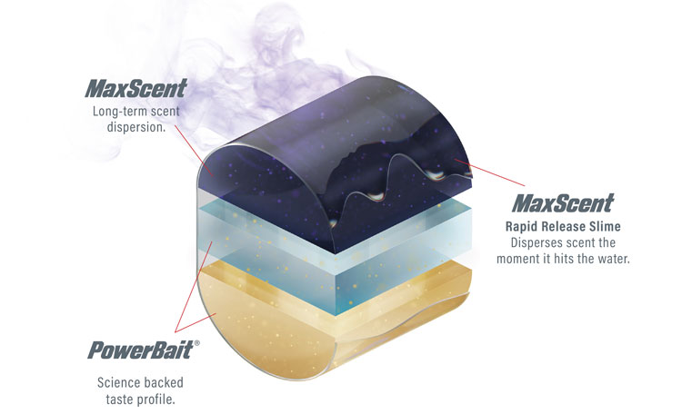 > Through a small-batch layered pouring process, Berkley combines a MaxScent layer, a proven PowerBait taste layer, and a MaxScent Rapid-Release Slime that provides an explosion of fish-attracting scent the moment it hits the water.