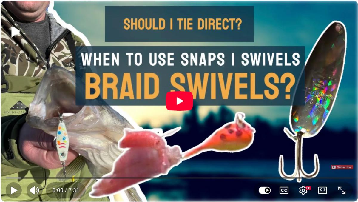 In this vid, he talks 1) when to tie direct vs using snaps, and also 2) how/when/why he uses a sneaky braided line split-ring trick on ice: