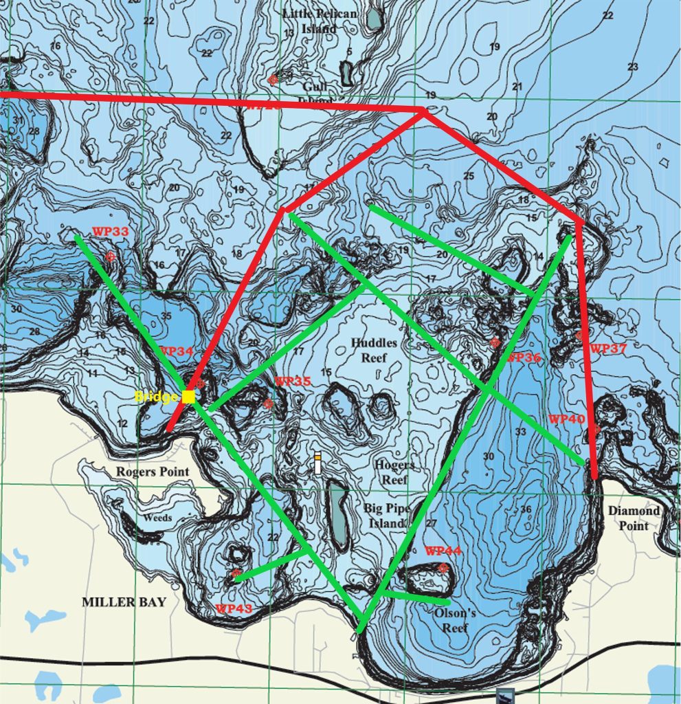 > “For walleyes in midwinter, it depends on your style of fishing. If you’re bringing your wheelhouse and truck up, you want to be in 16-25′, finding a rock/sand transition on one of the many rock reefs…[most recently] Rogers Point, Vipers Tooth, Huddles reef have been the most consistent bite for us.