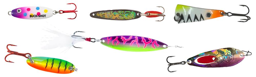 > Spoons like the Northland Buck-Shot, Swedish Pimple, VMC Tingler, Clam Leech Flutter Spoon, Frostbite Dinner Bell, or the Acme Kastmaster imitate injured baitfish and trigger reaction strikes from aggressive walleyes.