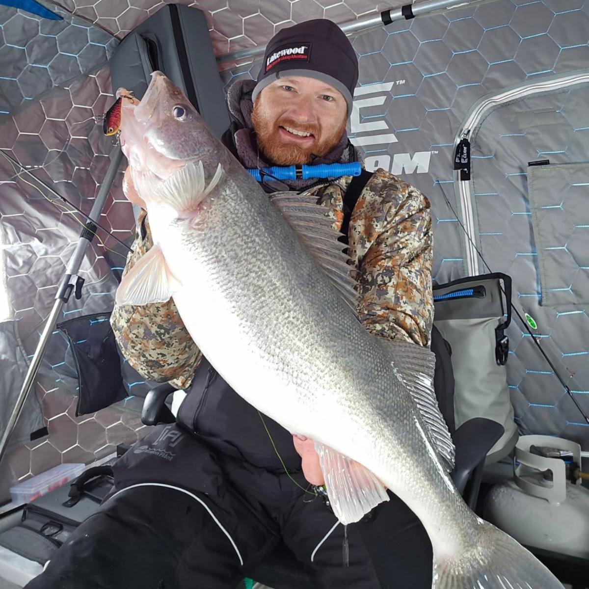 Lake Erie doesnāt always get fish-able ice, but when it does, you can bet Ross Robertson will be getting after āem! Looks like a a "redfire crawdad" color Rapala Rippinā Rap was on the menu:
